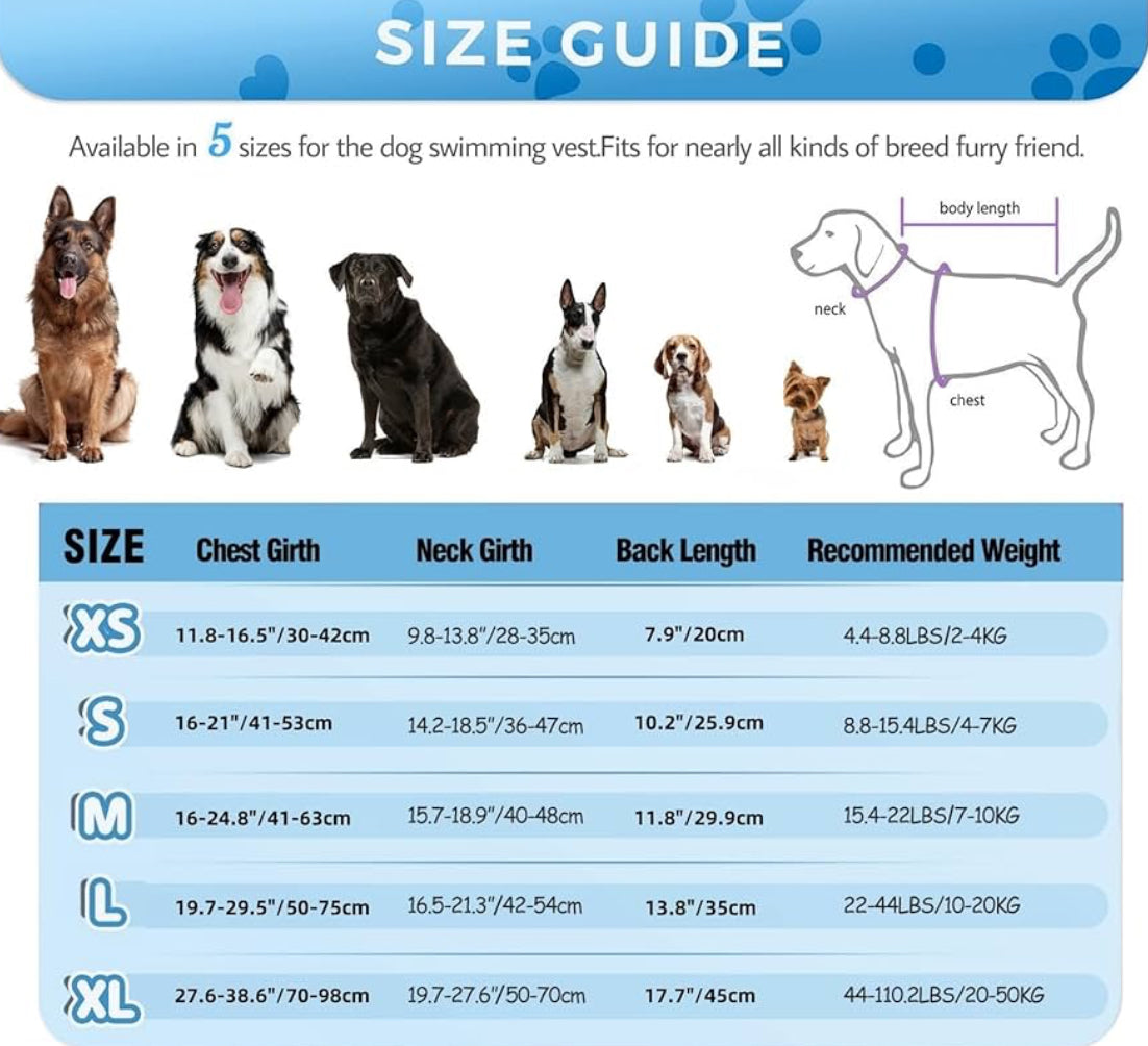 This dog life jacket features a rescue handle for easy pulling from the water, a heavy-duty D-ring for securing the leash, a red sliding buckle to prevent slipping, and adjustable straps that can be tailored to fit your dog's neck size.